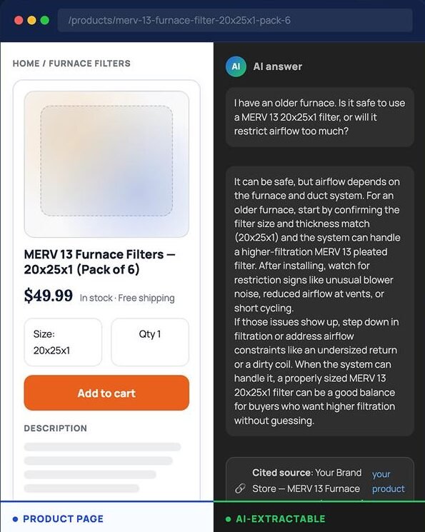 Buying queries include constraints and situations: fit, size, compatibility, material, use case, and “best for” context. AI answers cite pages that express those constraints in a scannable format. Thin descriptions and scattered specs reduce match quality and conversion confidence.