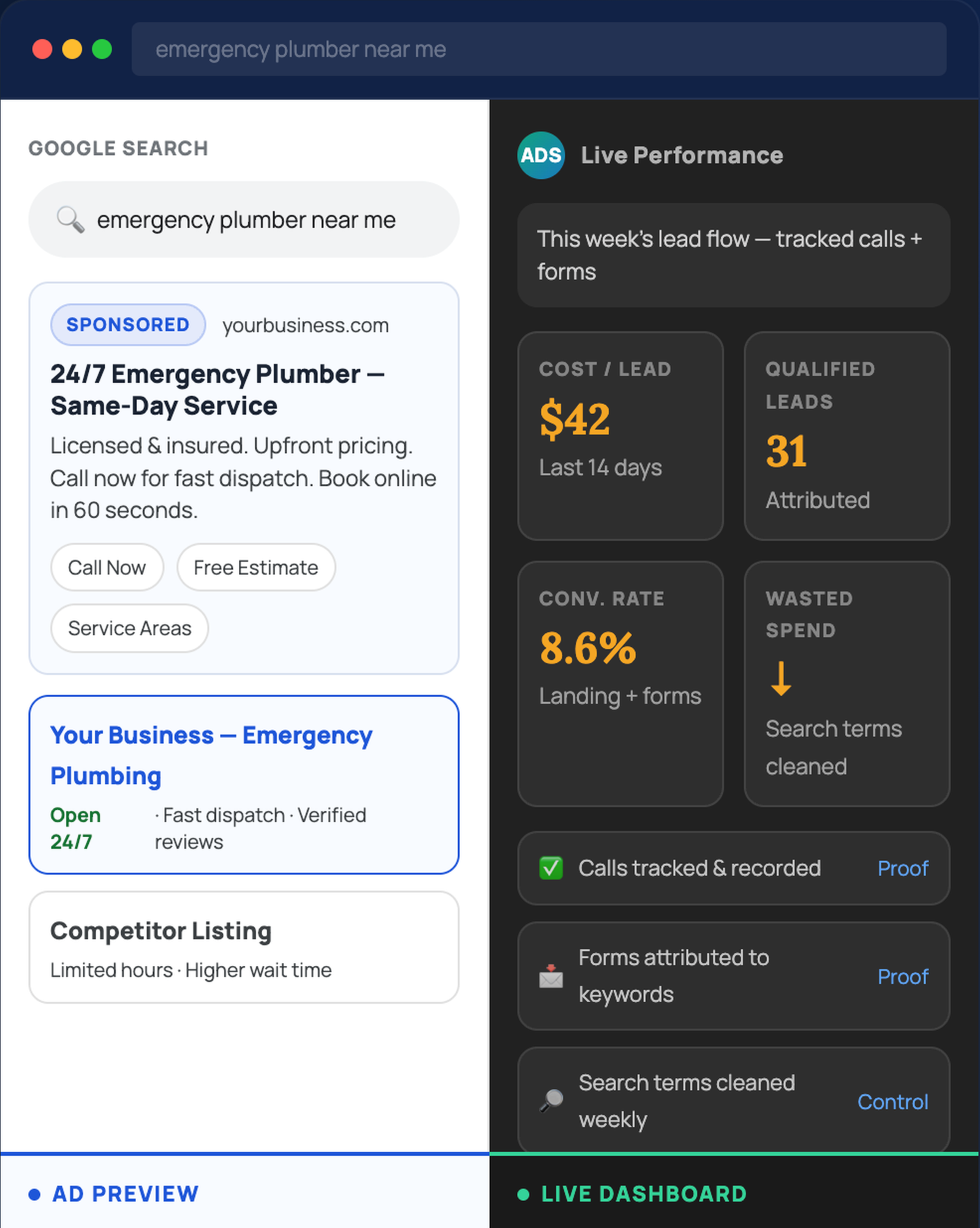 ✓ Live performance dashboard ✓ Conversion & call tracking ✓ Transparent reporting